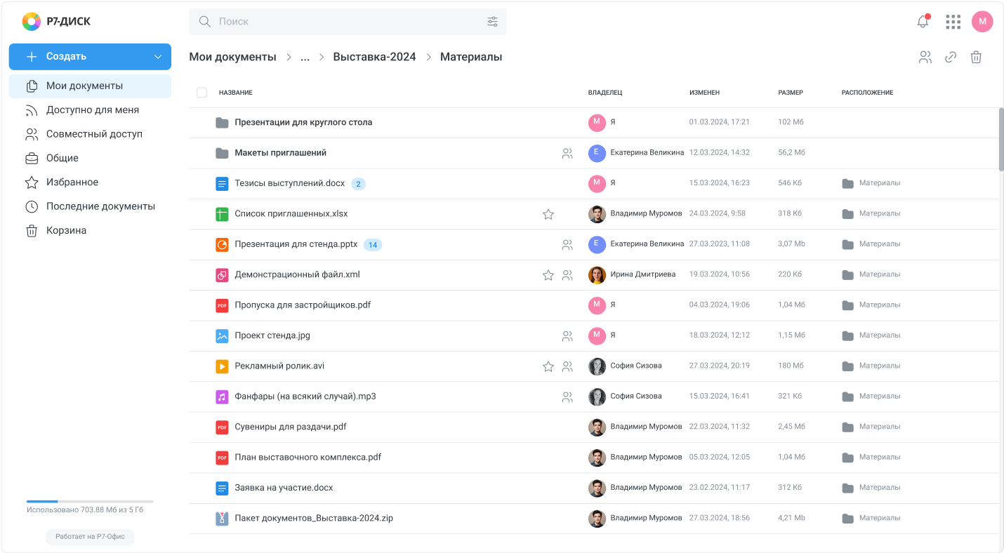 Р7-Диск предлагает адаптивный интерфейс, позволяющий работать с ним на любых устройствах, в том числе планшетах и смартфонах, и из любого браузера, без необходимости установки дополнительных приложений.